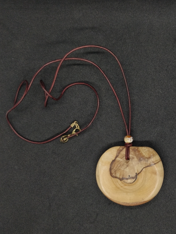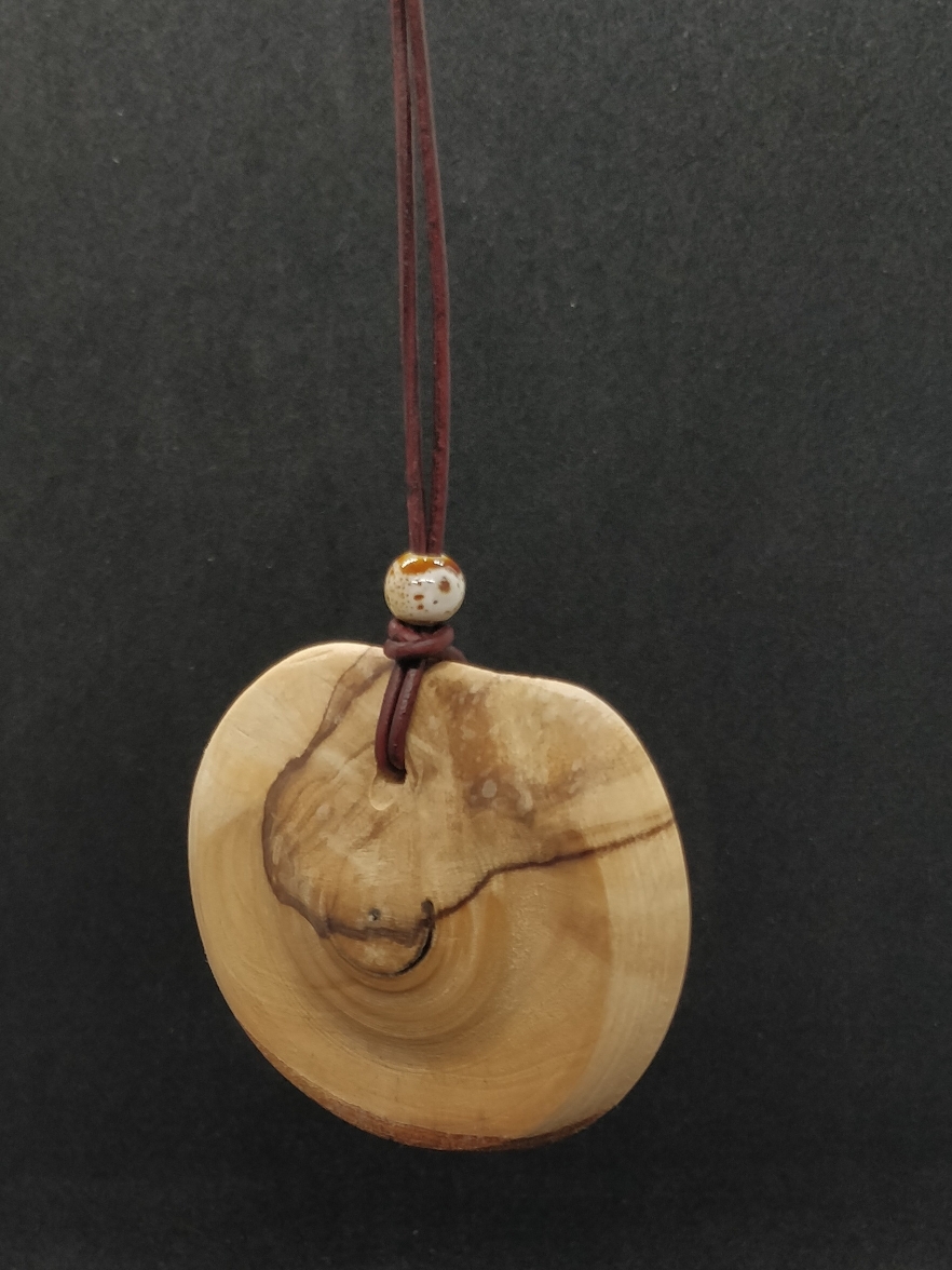 Le veinage de ce collier poétique, avec ses courbes, ses traces de tournage, un peu d’écorce dessinent toute l’harmonie de ce bijou en bois. Une petite perle en céramique porte une touche finale sur son fin cordon de cuir marron.