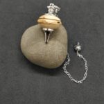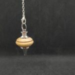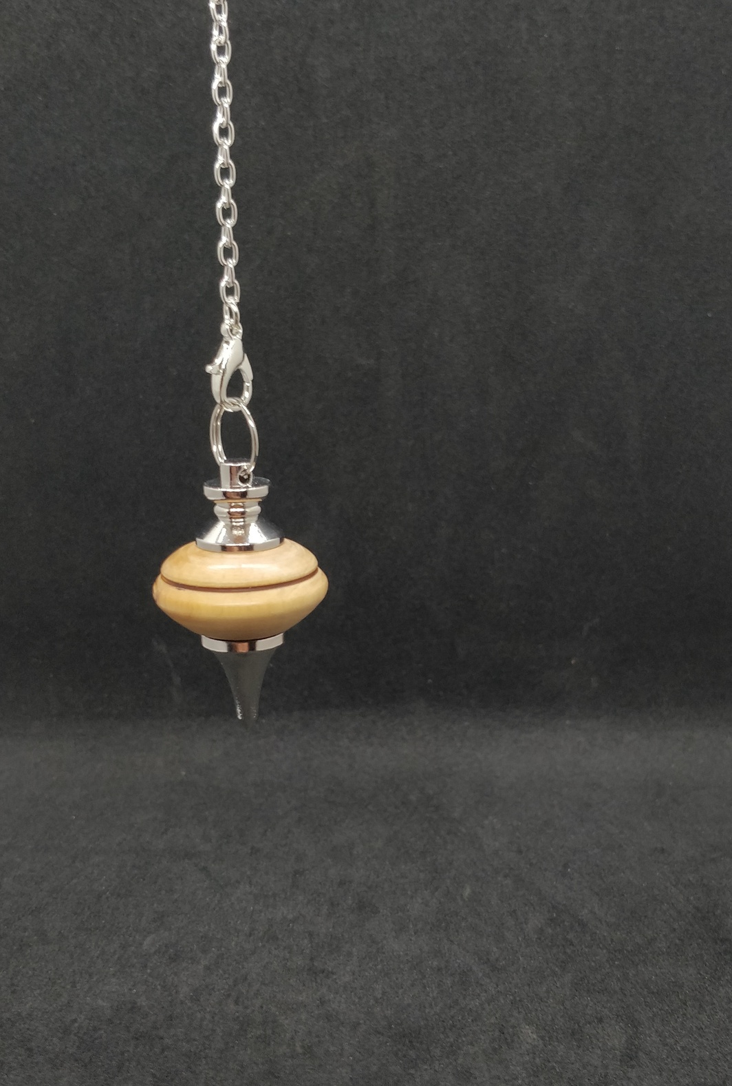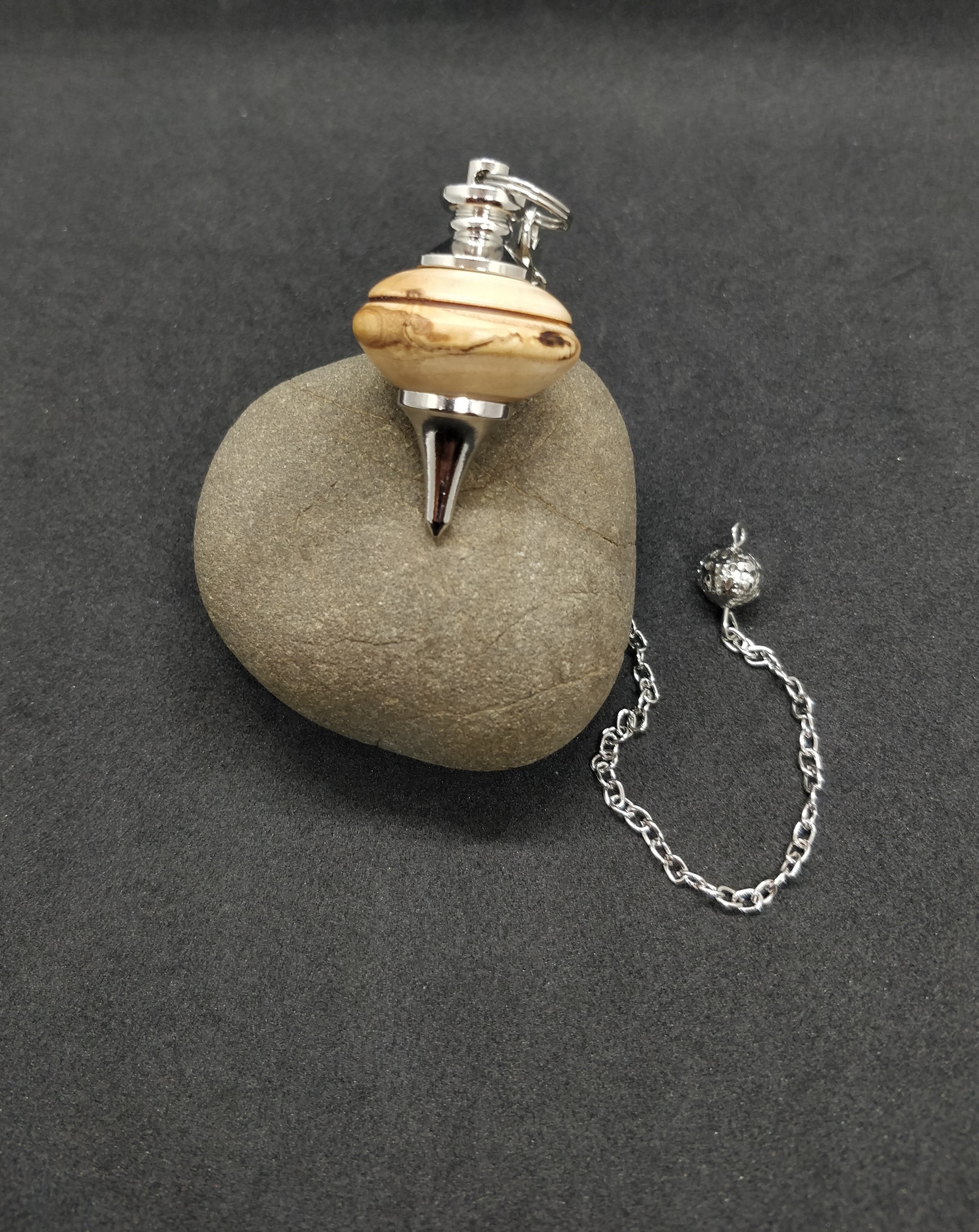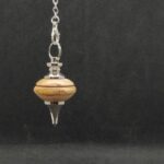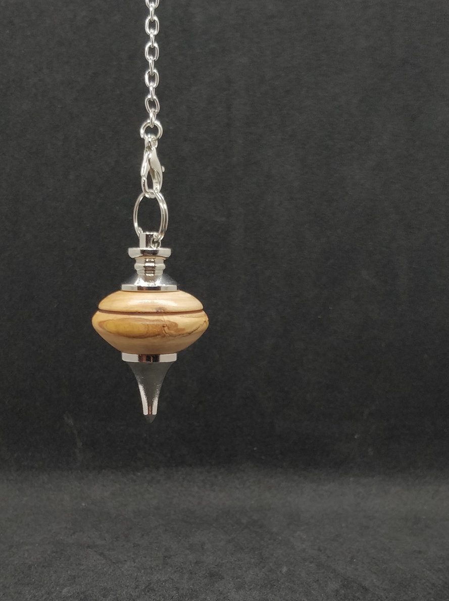 Pendule artisanal de radiesthésie en métal et bois d’OLIVIER de Charente Maritime et son veinage apparent. Forme circulaire, petit dynamique, s’emmène partout comme dans une poche.