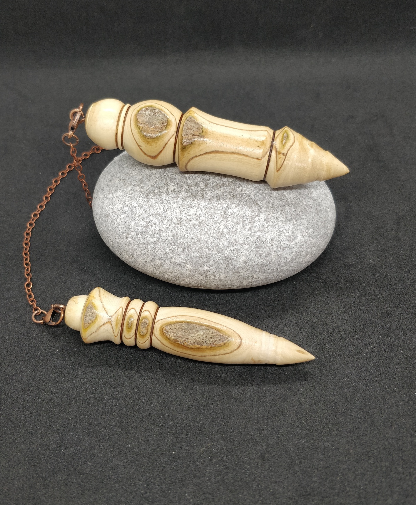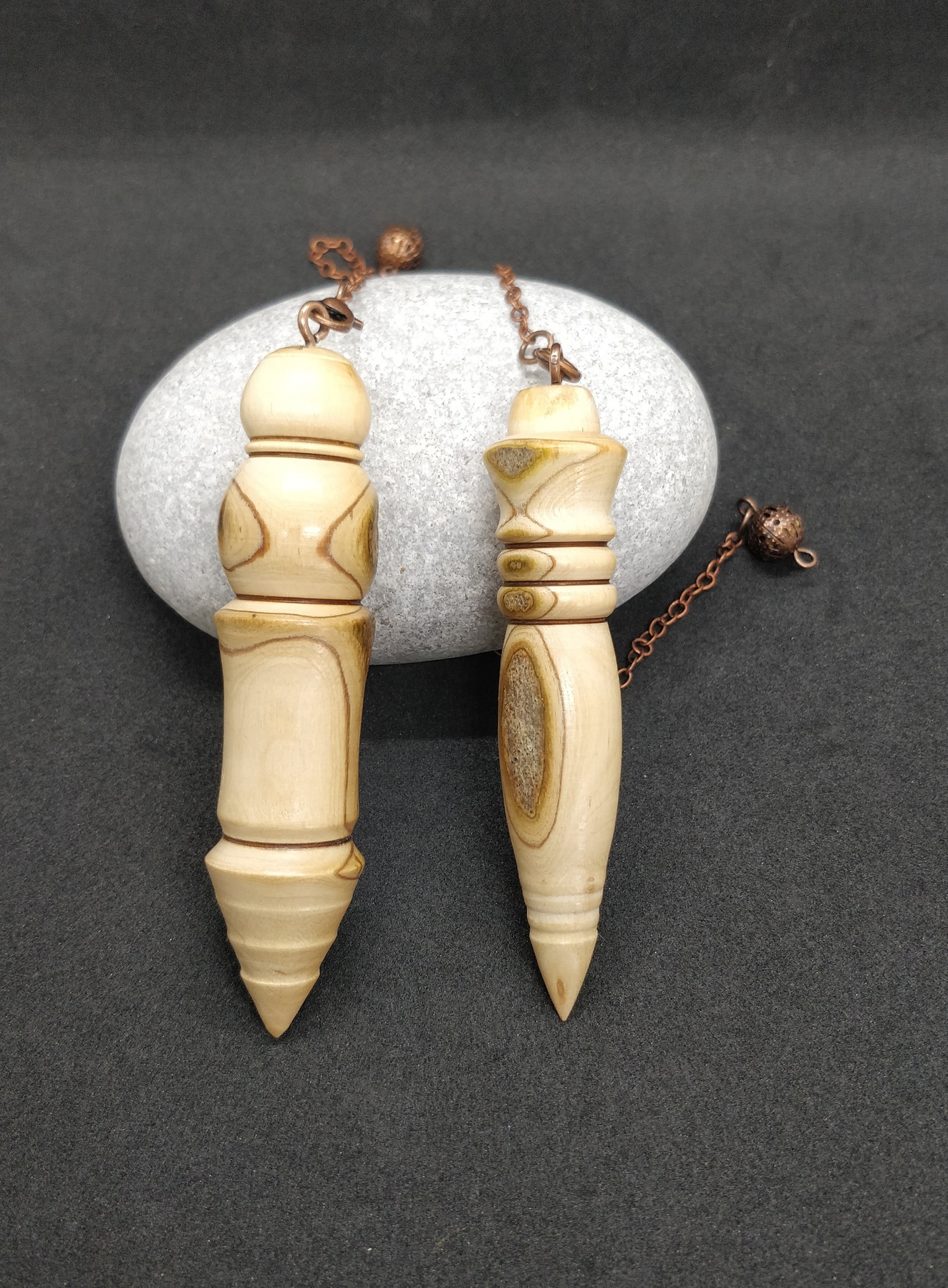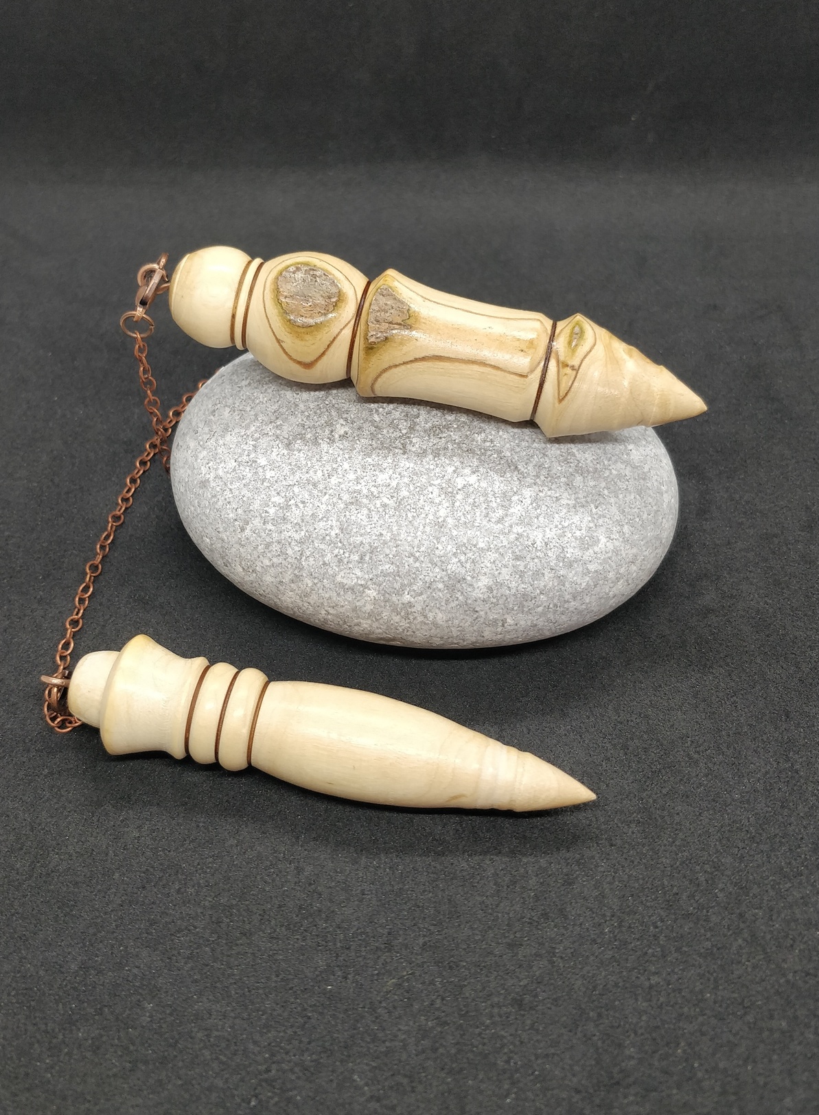 Voici 2 très jolis pendules de radiesthésie en Bois d’Olivier de Charente-Maritime. C’est un binôme, vendus ensemble !