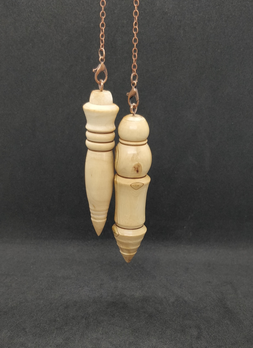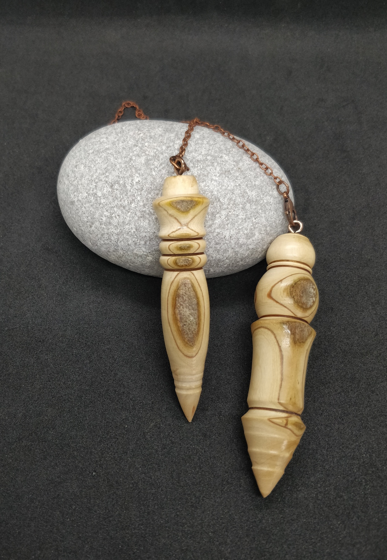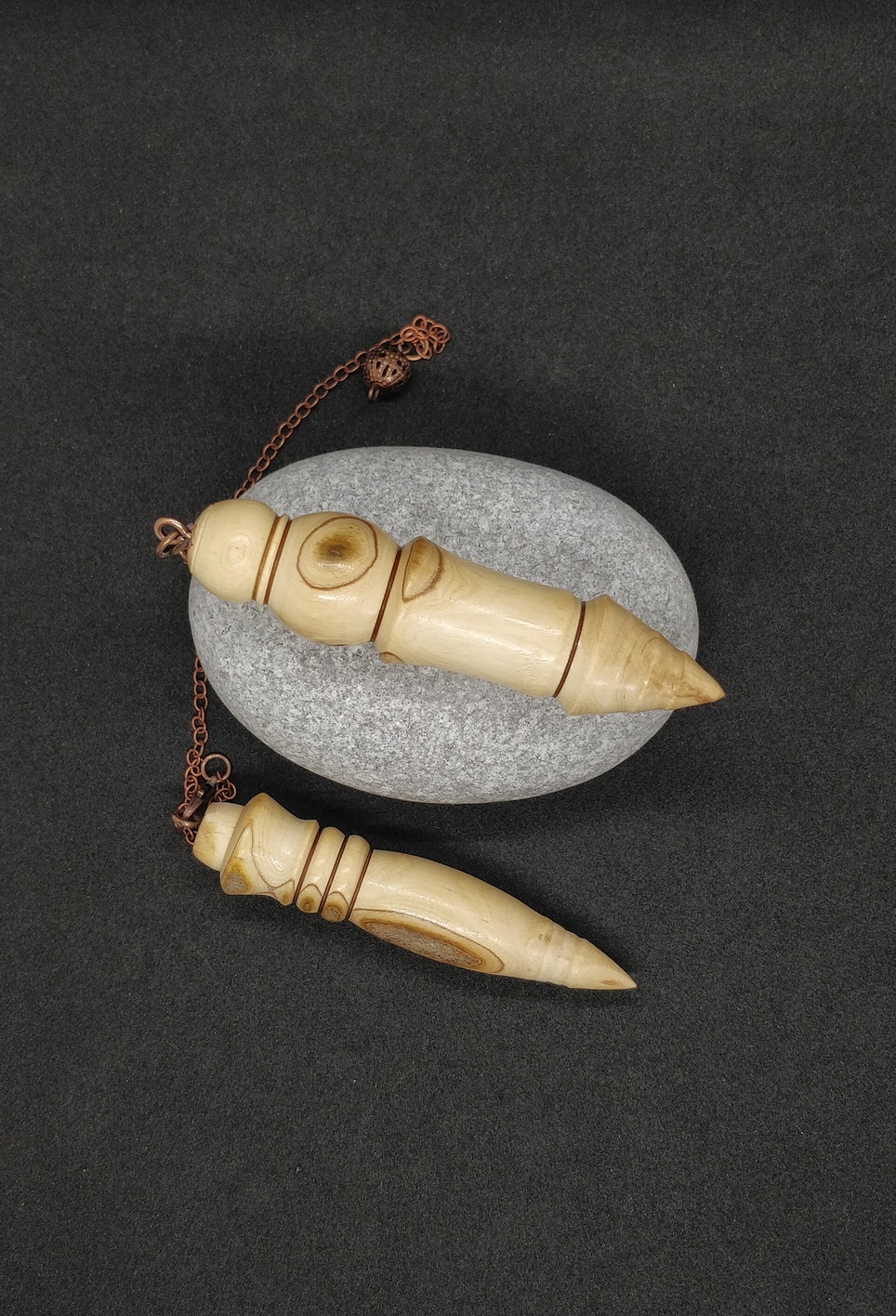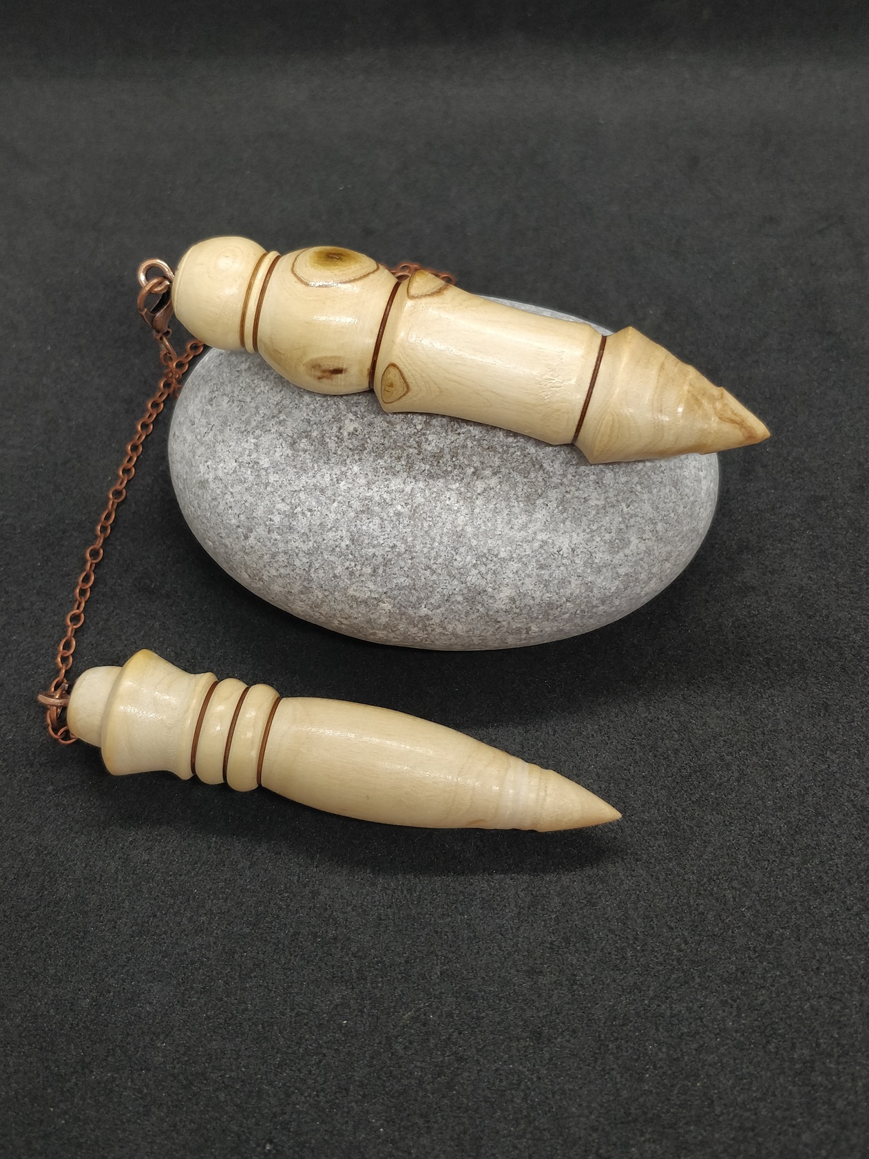 Voici 2 très jolis pendules de radiesthésie en Bois d’Olivier de Charente-Maritime. C’est un binôme, vendus ensemble !